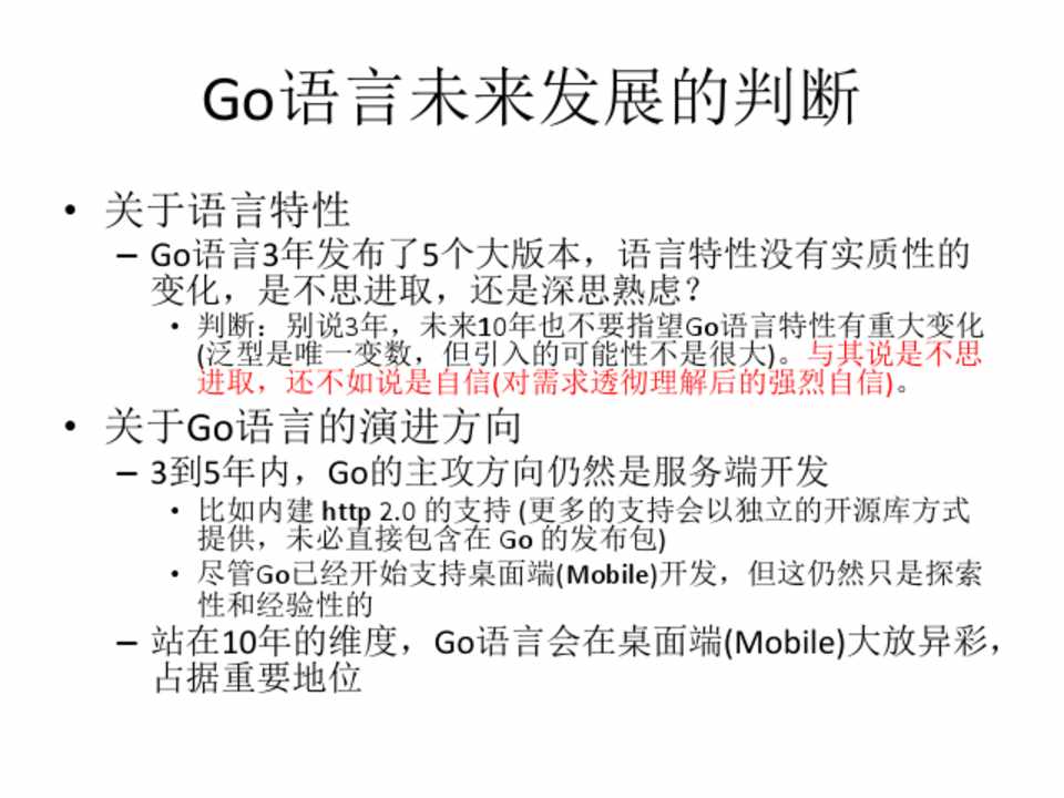 – 站在10年的维度,Go语言会在桌面端(Mobile)大放异彩, 占据重要地位