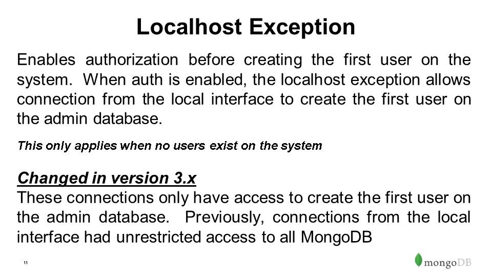 Enables authorization before creating the first user on the system. When auth is enabled, the localhost exception allows connection from the local interface to create the first user on the admin database.