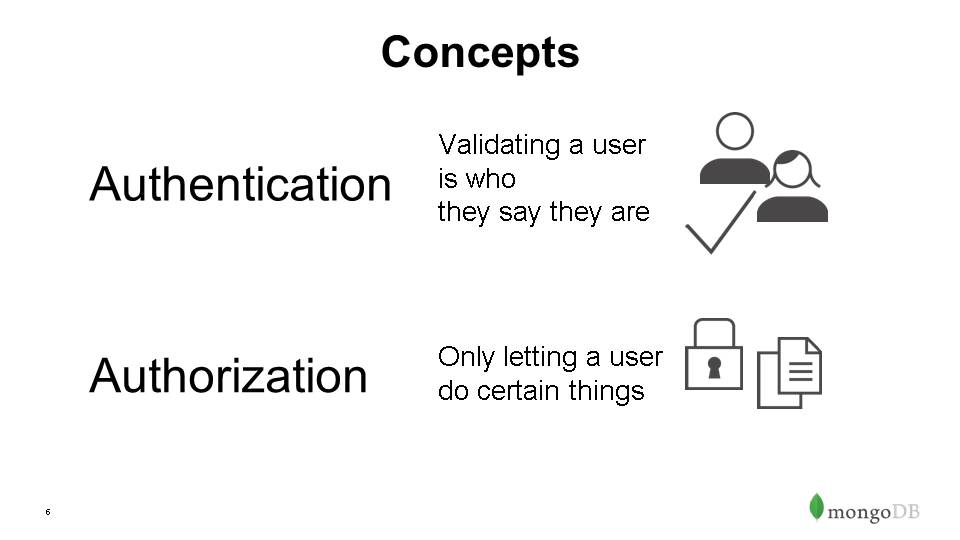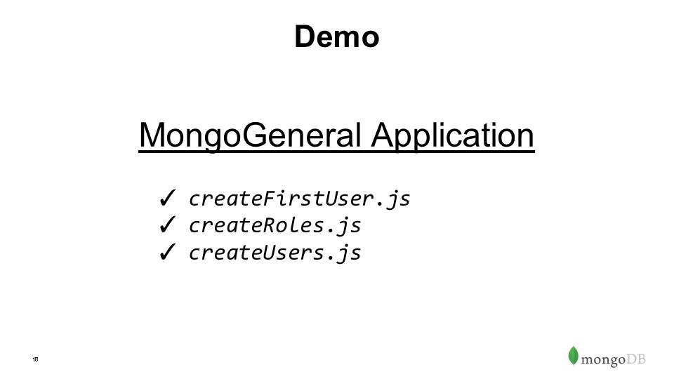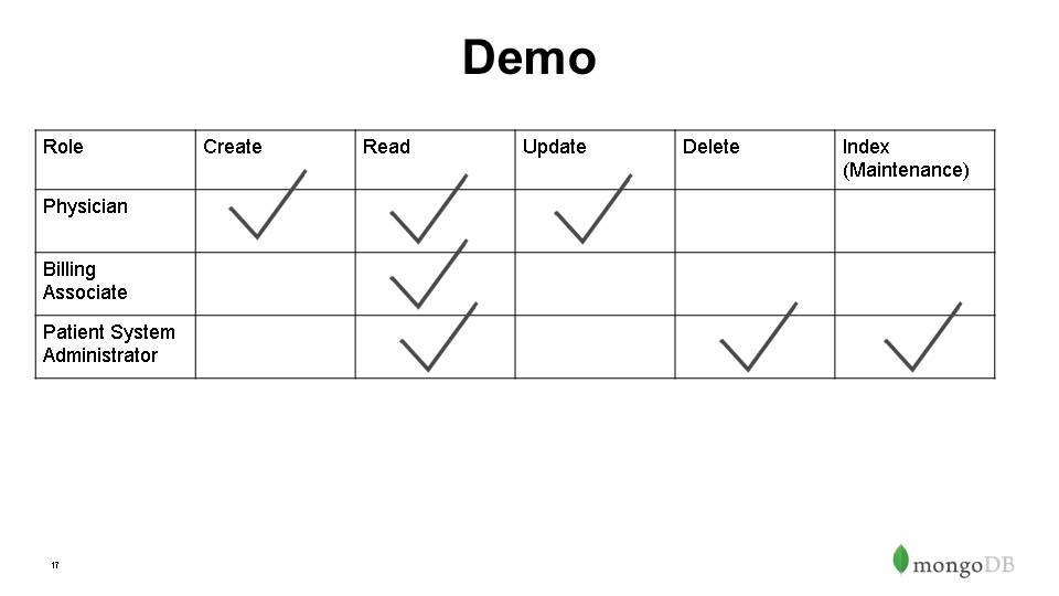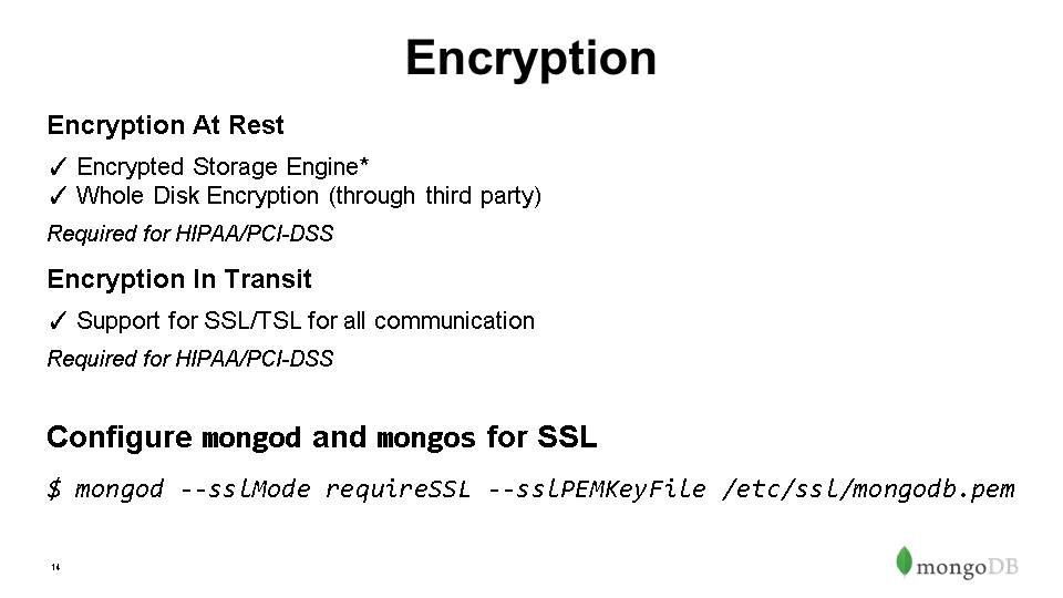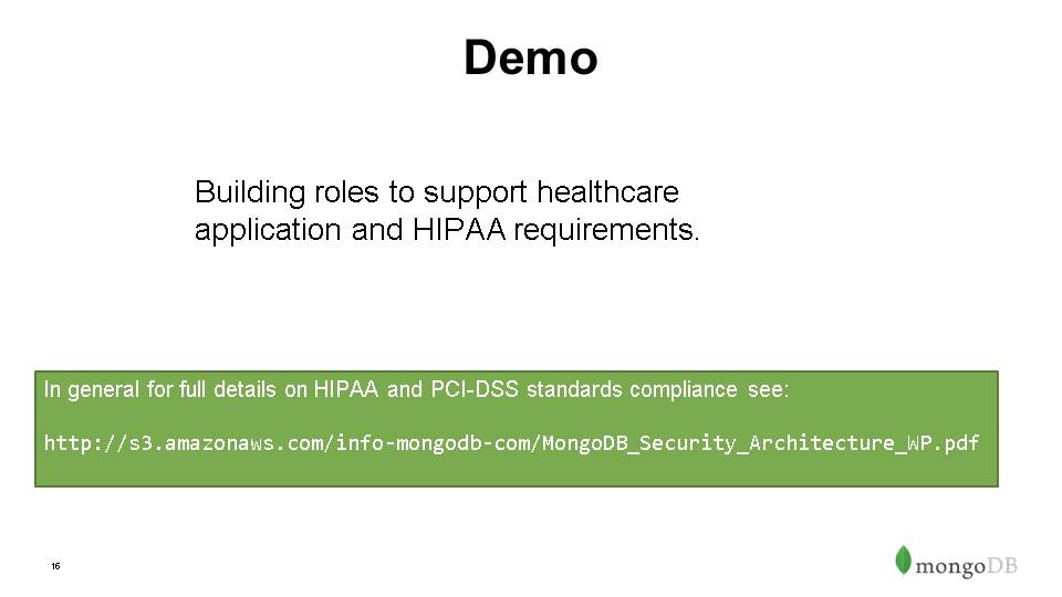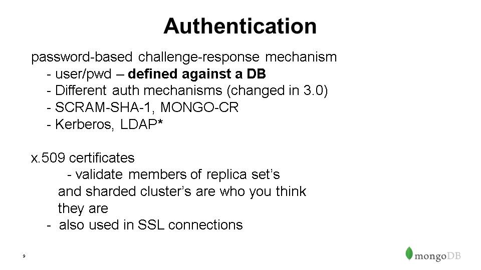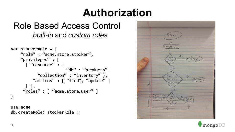 Authorization – Role Based Access Control, out-of-box roles & privileges, ability to build custom roles- can define over whole instance, db or even collection level