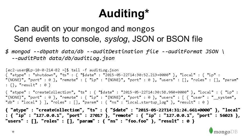 $ mongod --dbpath data/db --auditDestination file --auditFormat JSON \