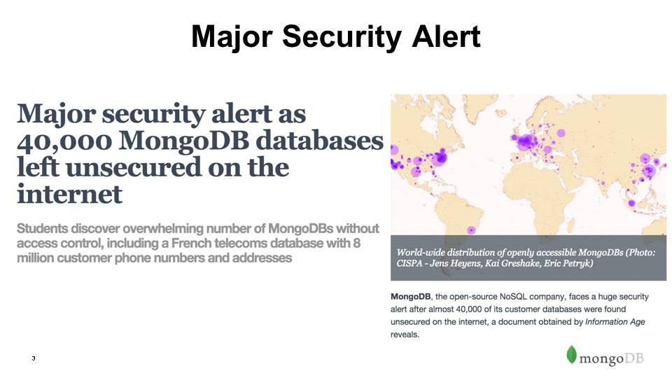 MongoDB is specifically designed for an awesome out-of-box developer experience. You can get your apps up and running very easily. But, this means that most (well like all) the security features are TURNED OFF by DEFAULT. Devs love this, OPS not so much.