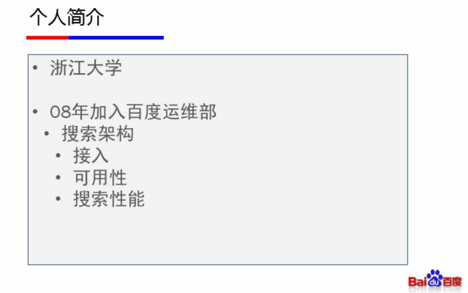 • 08年加入百度运维部 • 搜索架构 • 接入 • 可用性 • 搜索性能