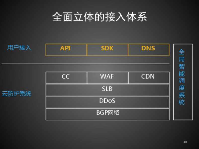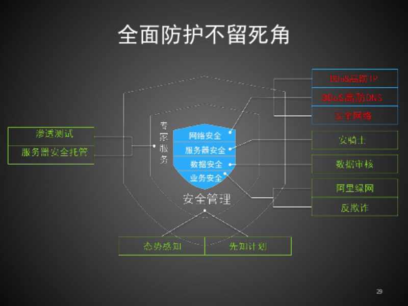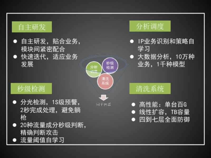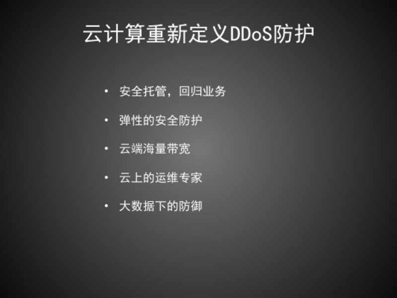 • 安全托管,回归业务 • 弹性的安全防护 • 云端海量带宽 • 云上的运维专家 • 大数据下的防御