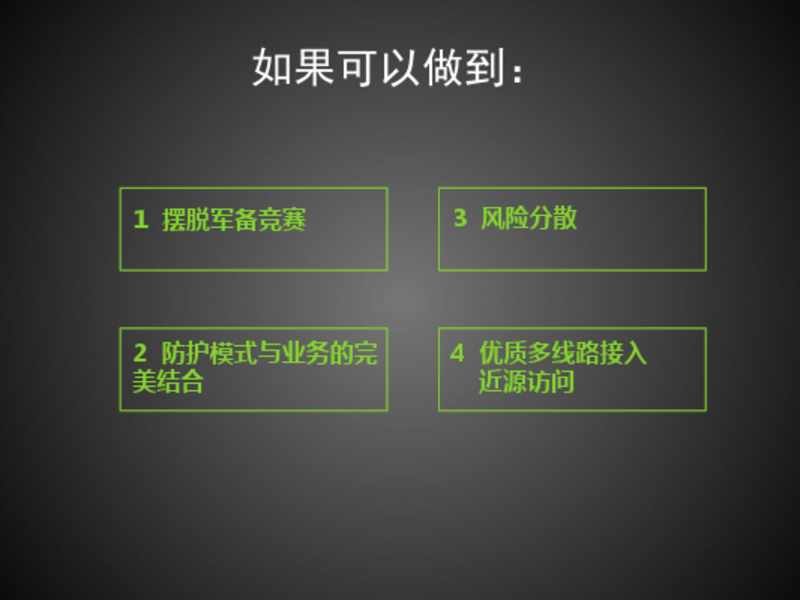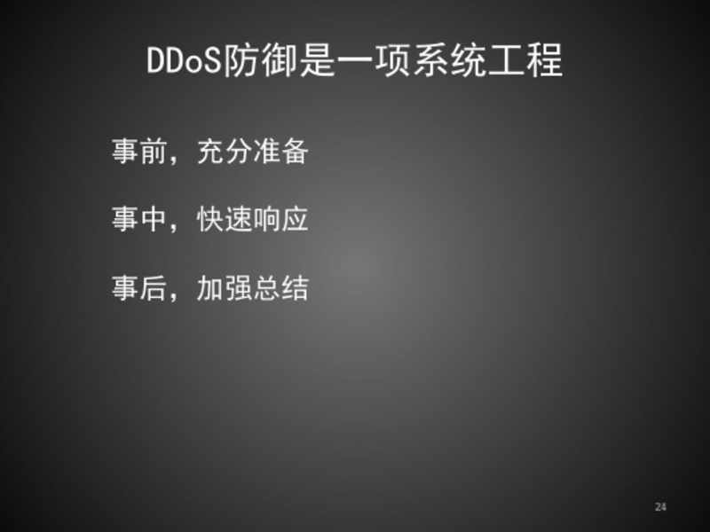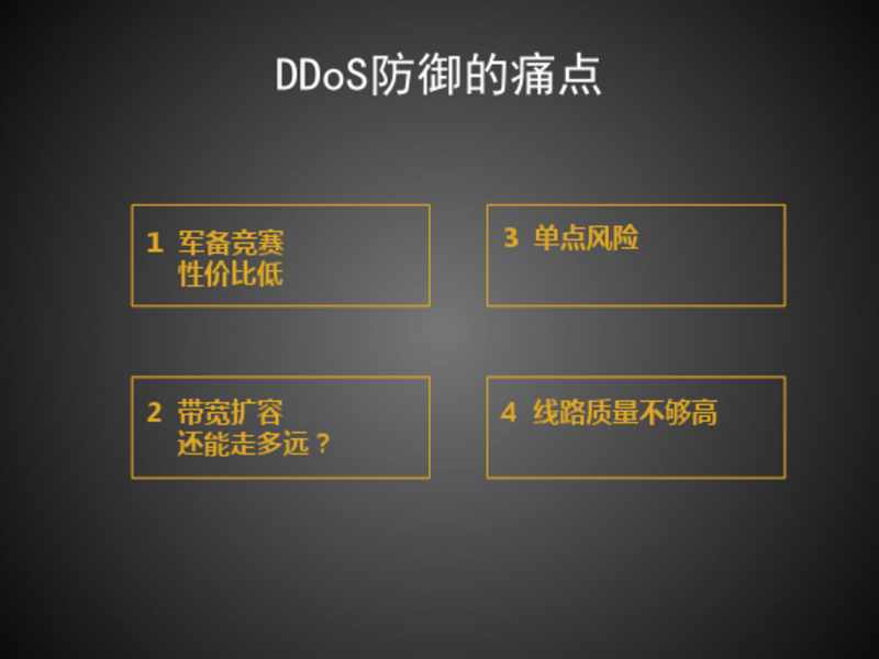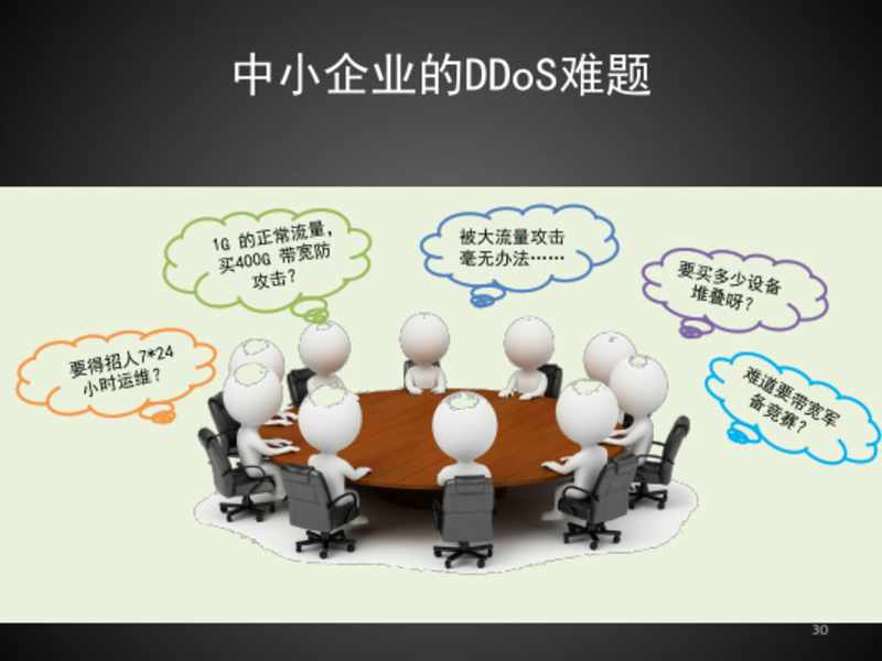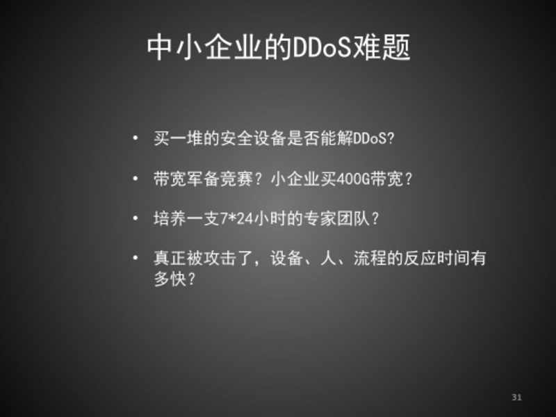 • 买一堆的安全设备是否能解DDoS? • 带宽军备竞赛?小企业买400G带宽? • 培养一支7*24小时的专家团队? • 真正被攻击了,设备、人、流程的反应时间有