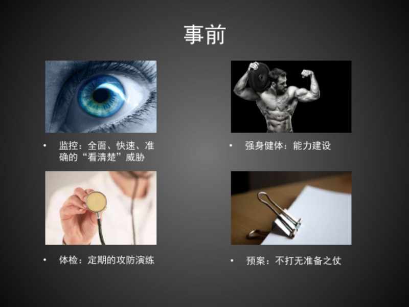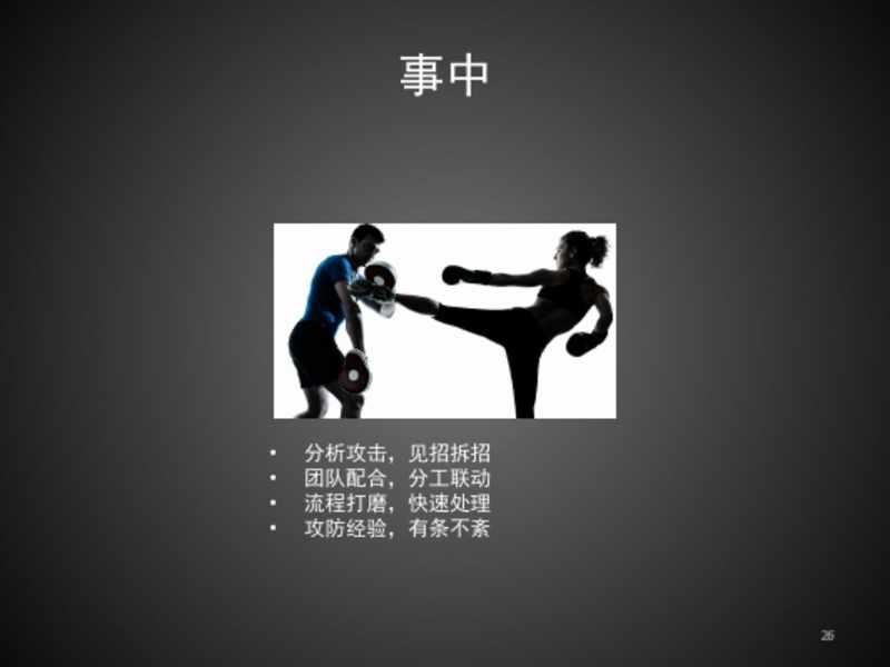 • 分析攻击,见招拆招 • 团队配合,分工联动 • 流程打磨,快速处理 • 攻防经验,有条不紊