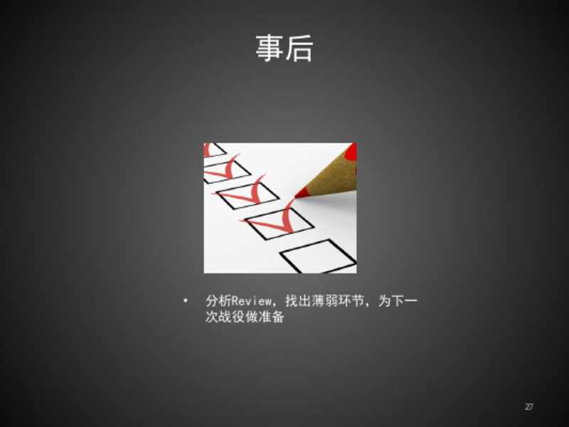 • 分析Review,找出薄弱环节,为下一 次战役做准备
