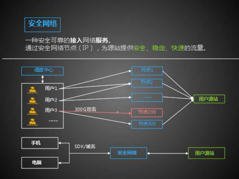 一种安全可靠的接入网络服务。 通过安全网络节点(IP),为源站提供安全、稳定、快速的流量。