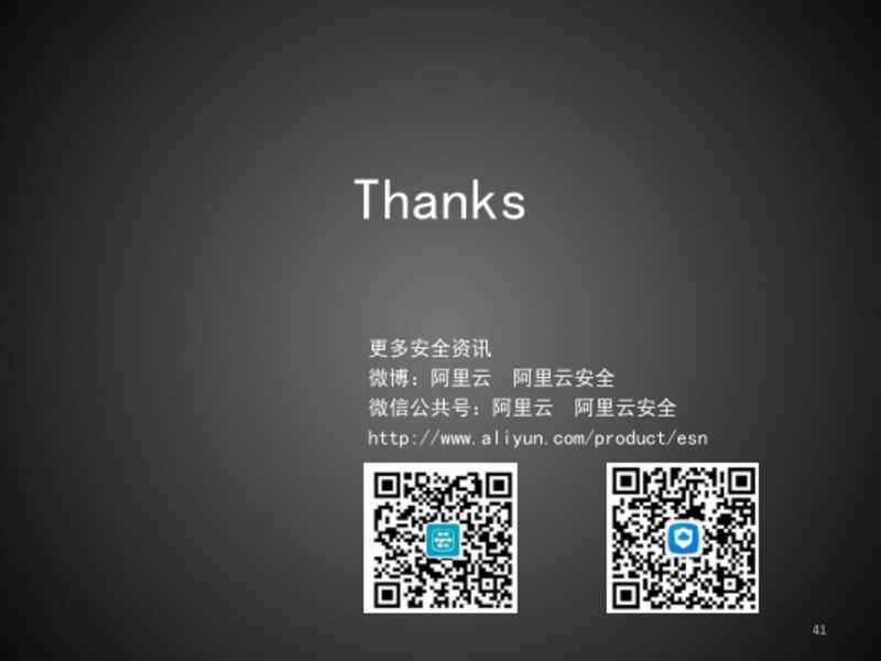 更多安全资讯 微博:阿里云 阿里云安全 微信公共号:阿里云 阿里云安全 http://www.aliyun.com/product/esn