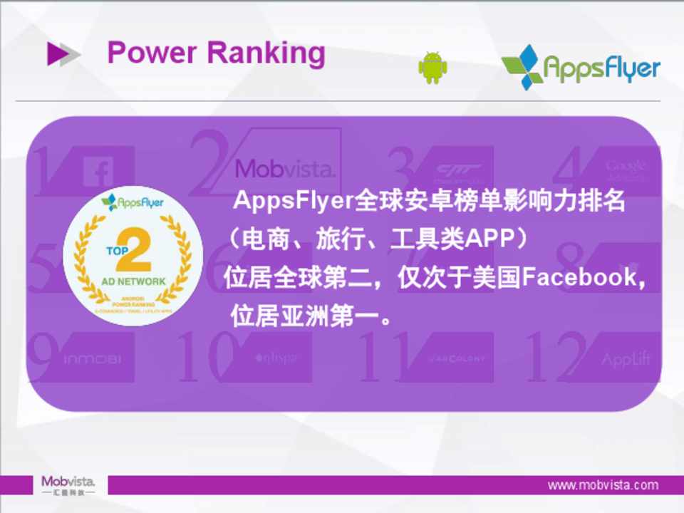 AppsFlyer全球安卓榜单影响力排名 (电商、旅行、工具类APP) 位居全球第二,仅次于美国Facebook,
