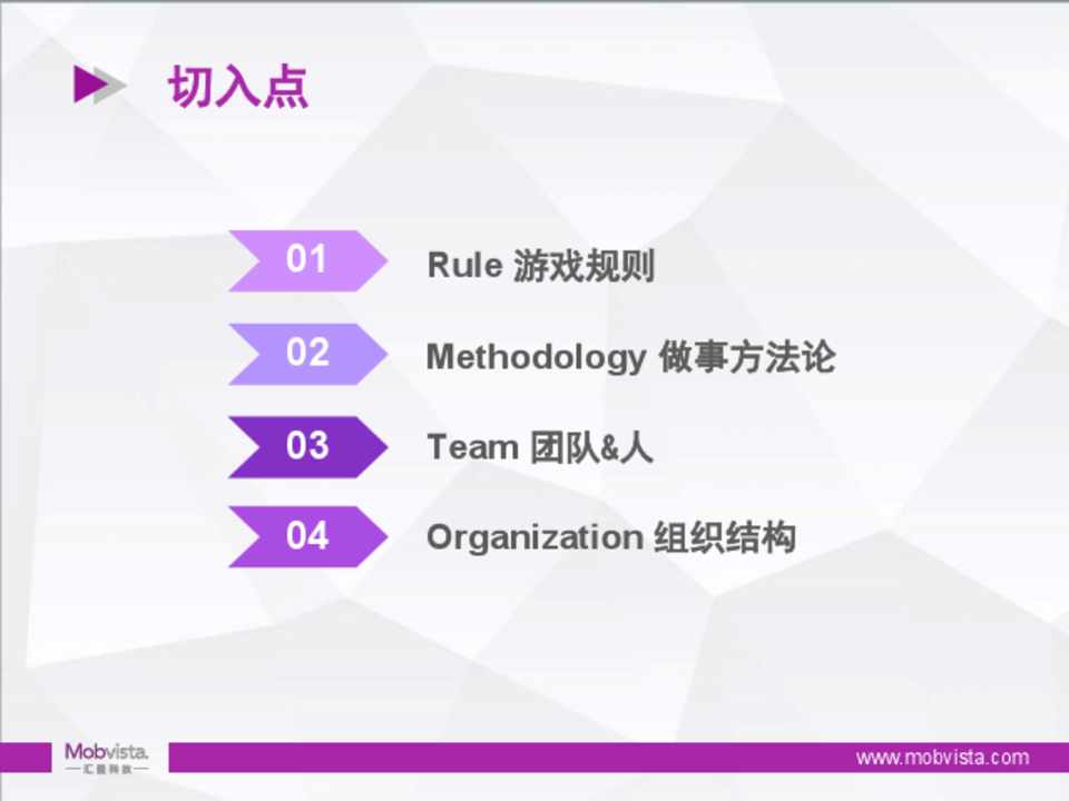 01 Rule 游戏规则 02 Methodology 做事方法论 03 Team 团队&人 04 Organization 组织结构