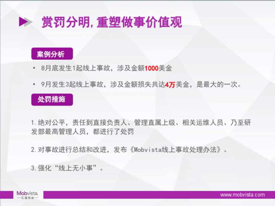 1.绝对公平,责任到直接负责人、管理直属上级、相关运维人员、乃至研 发部最高管理人员,都进行了处罚 2.对事故进行总结和改进,发布《Mobvista线上事故处理办法》。 3.强化“线上无小事”。