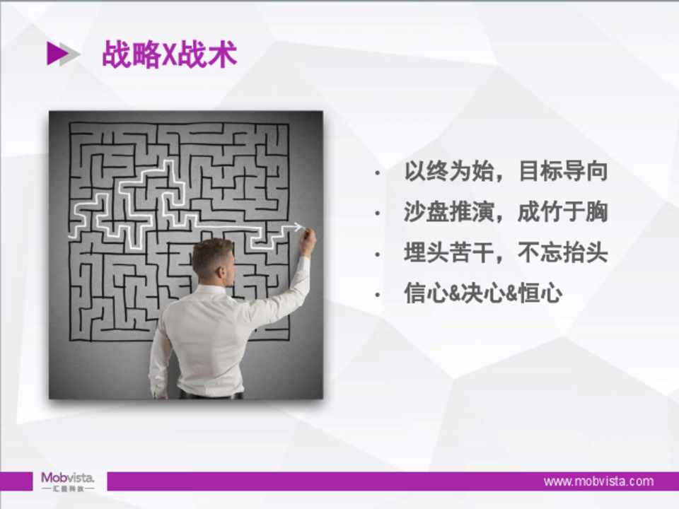 • 以终为始,目标导向 • 沙盘推演,成竹于胸 • 埋头苦干,不忘抬头 • 信心&决心&恒心