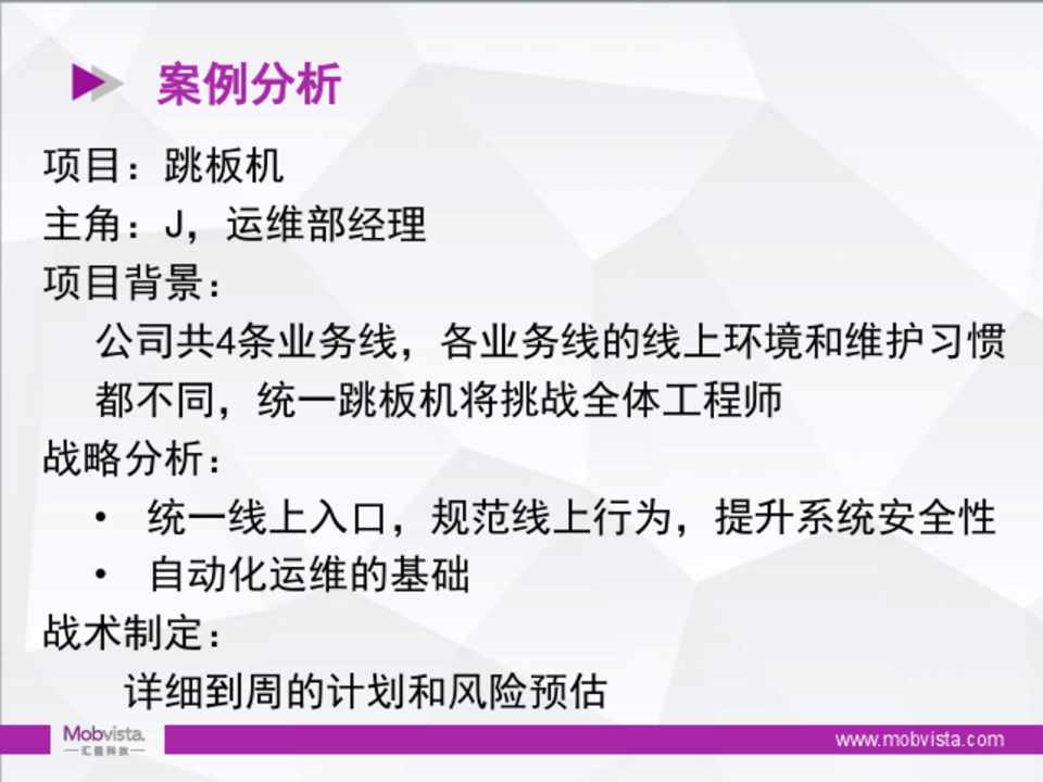 公司共4条业务线,各业务线的线上环境和维护习惯 都不同,统一跳板机将挑战全体工程师 战略分析: • 统一线上入口,规范线上行为,提升系统安全性 • 自动化运维的基础 战术制定: