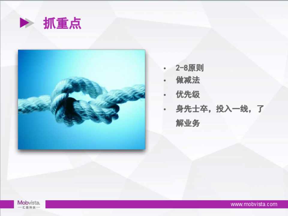 • 2-8原则 • 做减法 • 优先级 • 身先士卒,投入一线,了
