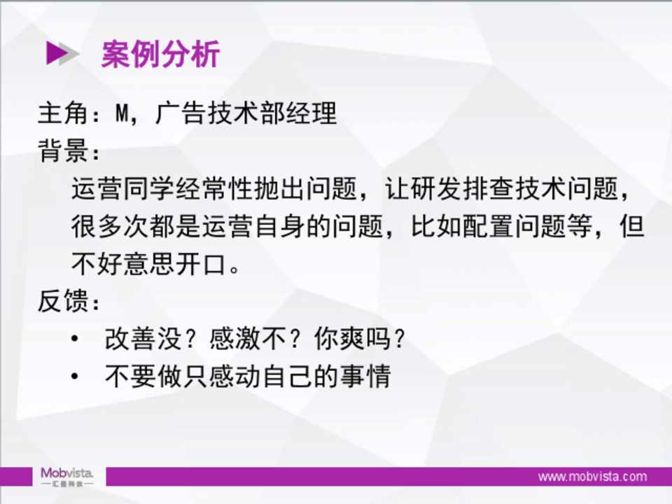 运营同学经常性抛出问题,让研发排查技术问题, 很多次都是运营自身的问题,比如配置问题等,但 不好意思开口。 反馈: • 改善没?感激不?你爽吗? • 不要做只感动自己的事情