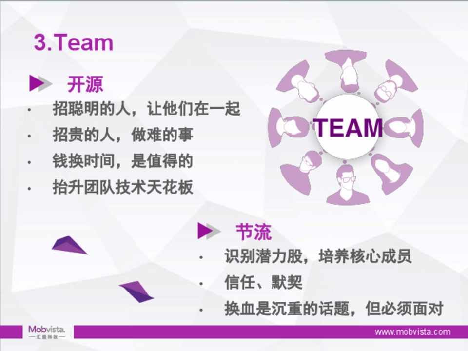 • 识别潜力股,培养核心成员 • 信任、默契 • 换血是沉重的话题,但必须面对
