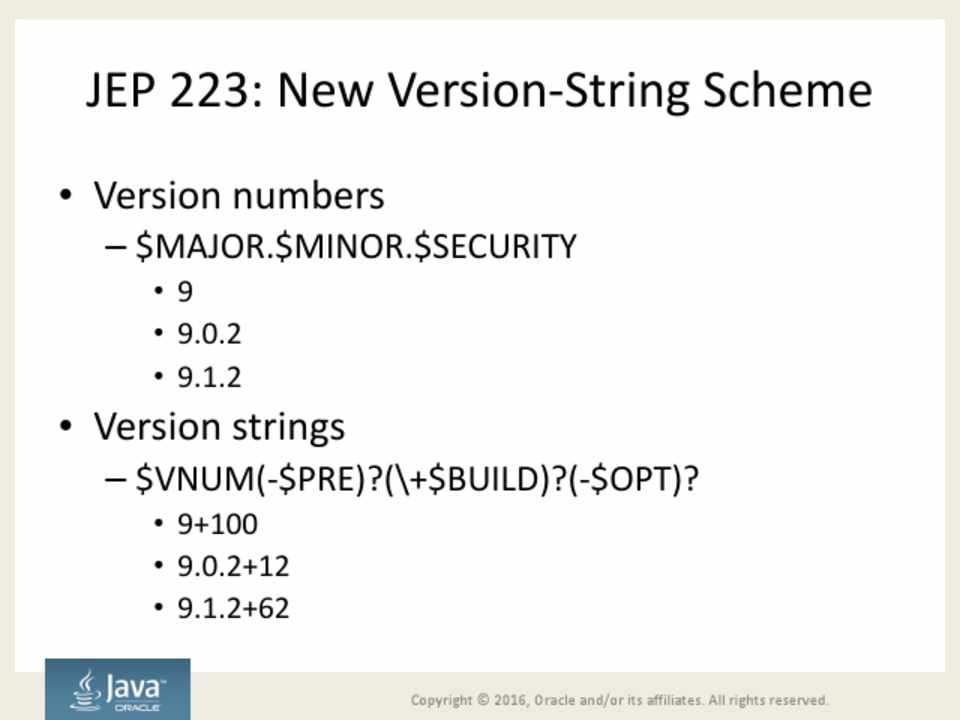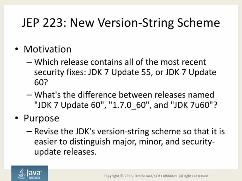 – Revise the JDK's version-string scheme so that it is easier to distinguish major, minor, and securityupdate releases.
