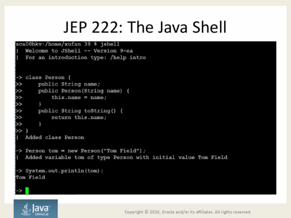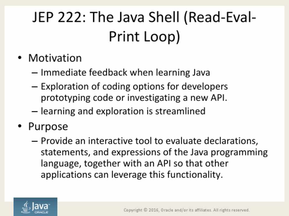 JEP 222: The Java Shell (Read-EvalPrint Loop)