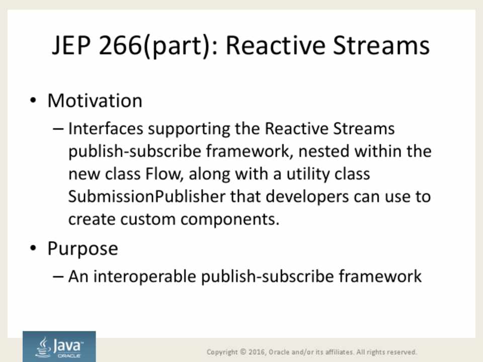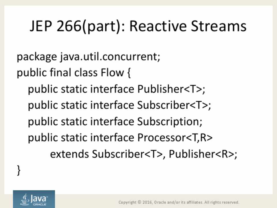 – Interfaces supporting the Reactive Streams publish-subscribe framework, nested within the new class Flow, along with a utility class SubmissionPublisher that developers can use to create custom components.