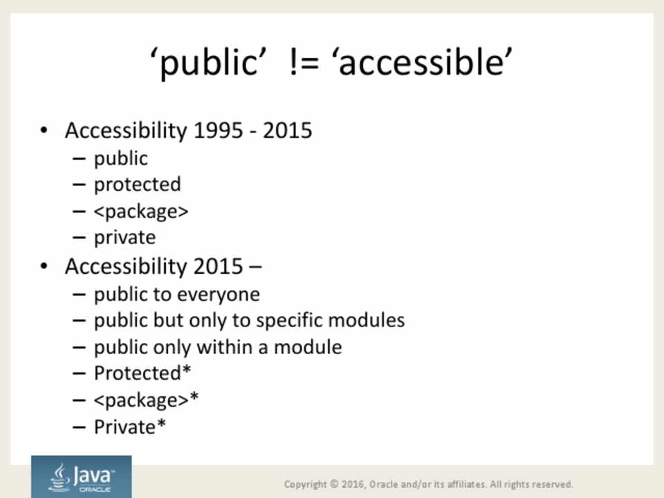 – public to everyone – public but only to specific modules – public only within a module – Protected* – <package>* – Private*