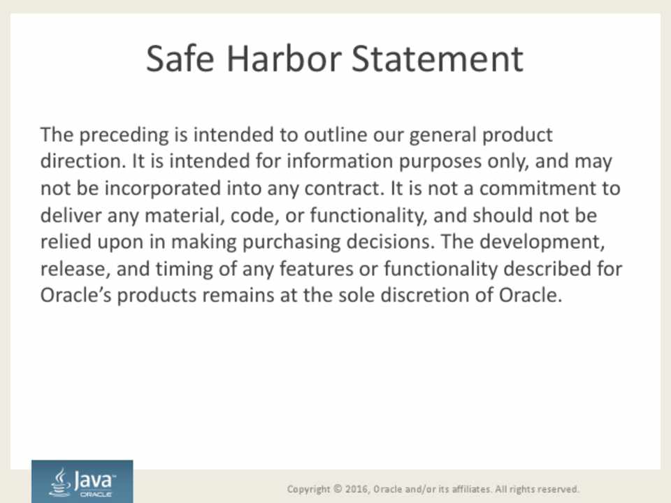 The preceding is intended to outline our general product direction. It is intended for information purposes only, and may not be incorporated into any contract. It is not a commitment to deliver any material, code, or functionality, and should not be relied upon in making purchasing decisions. The development, release, and timing of any features or functionality described for Oracle’s products remains at the sole discretion of Oracle.