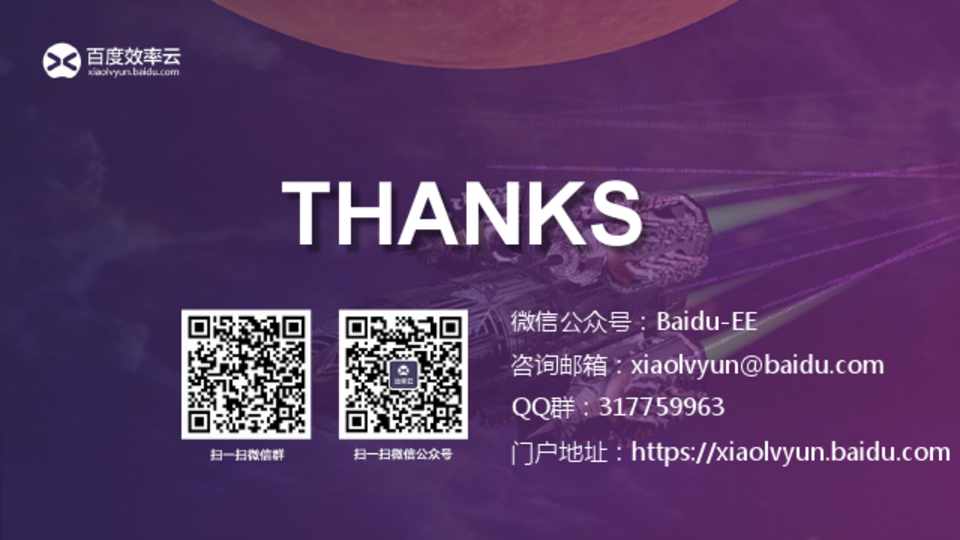 微信公众号:Baidu-EE 咨询邮箱:xiaolvyun@baidu.com QQ群:317759963 门户地址:https://xiaolvyun.baidu.com