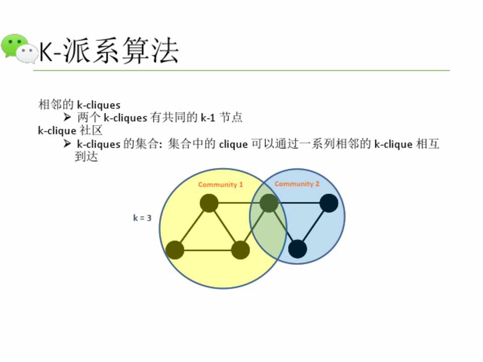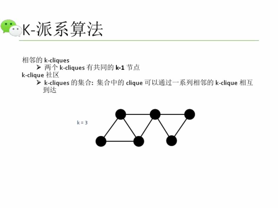 k-clique 社区 Ø k-cliques 的集合: 集合中的 clique 可以通过一系列相邻的 k-clique 相互 到达
