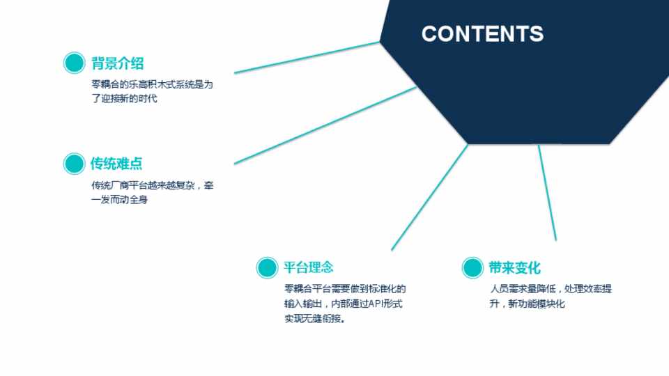 零耦合平台需要做到标准化的 输入输出,内部通过API形式 实现无缝衔接。