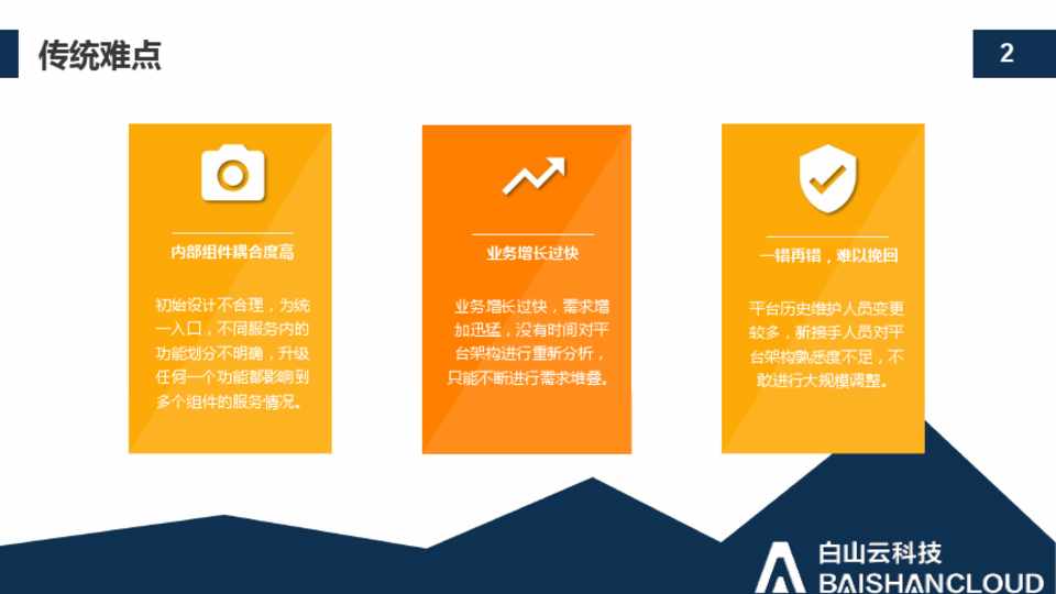 初始设计不合理,为统 一入口,不同服务内的 功能划分不明确,升级 任何一个功能都影响到 多个组件的服务情况。