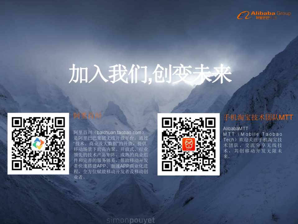AlibabaMTT MTT(Mobile Taobao Tech)欢迎关注手机淘宝技 术团队,交流分享无线技 术,共创移动开发无限未 来。