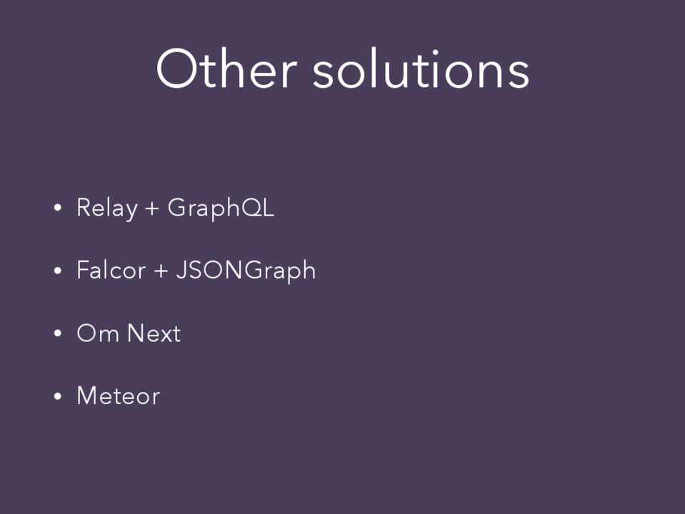 • Relay + GraphQL • Falcor + JSONGraph • Om Next • Meteor