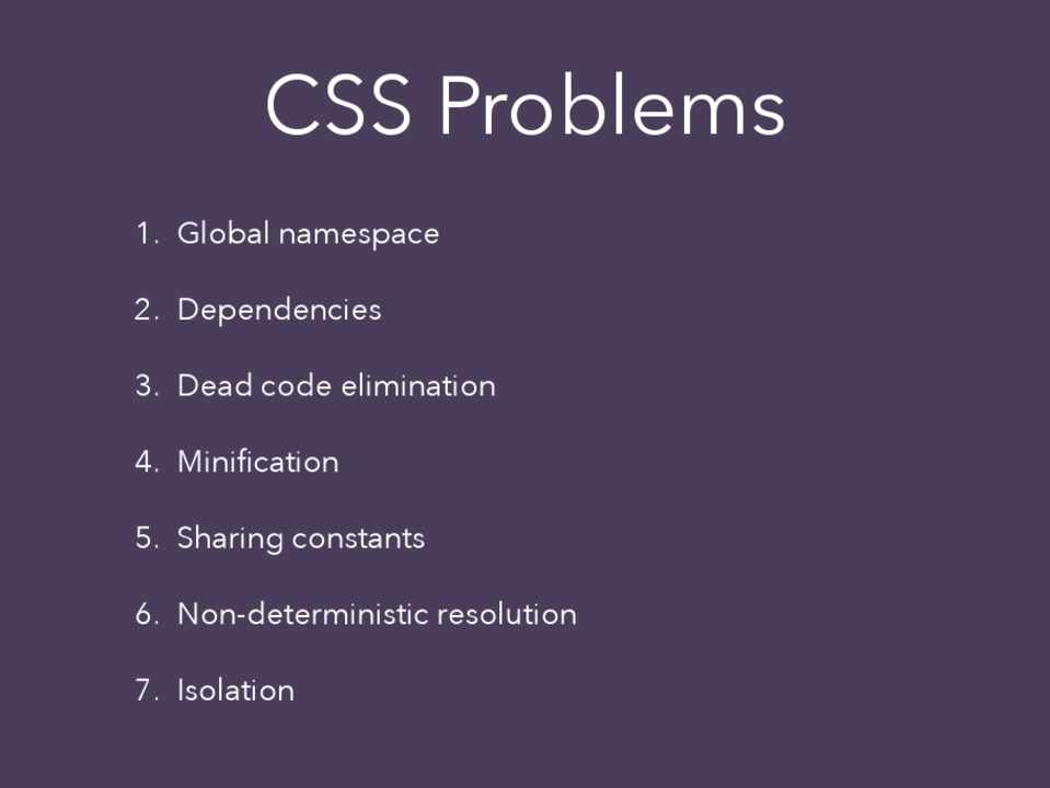 1. Global namespace - solved 2. Dependencies - solved 3. Dead code elimination - solved 4. Minification - solved 5. Sharing constants - solved 6. Non-deterministic resolution - solved 7. Isolation - solved