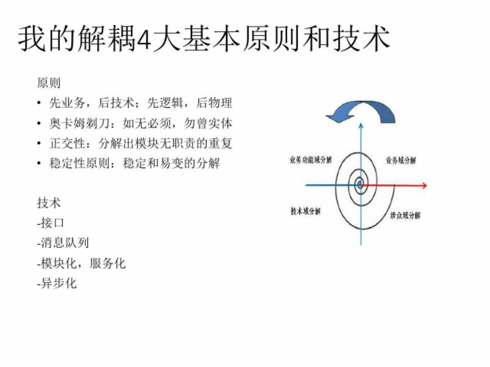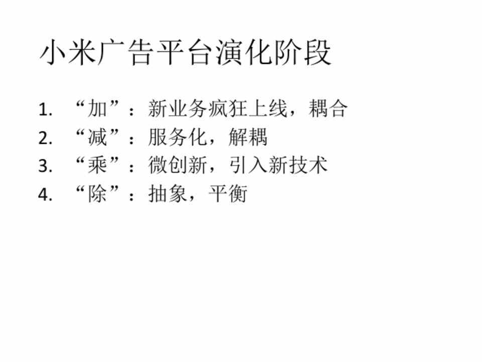 1. “加”:新业务疯狂上线,耦合 2. “减”:服务化,解耦 3. “乘”:微创新,引入新技术 4. “除”:抽象,平衡