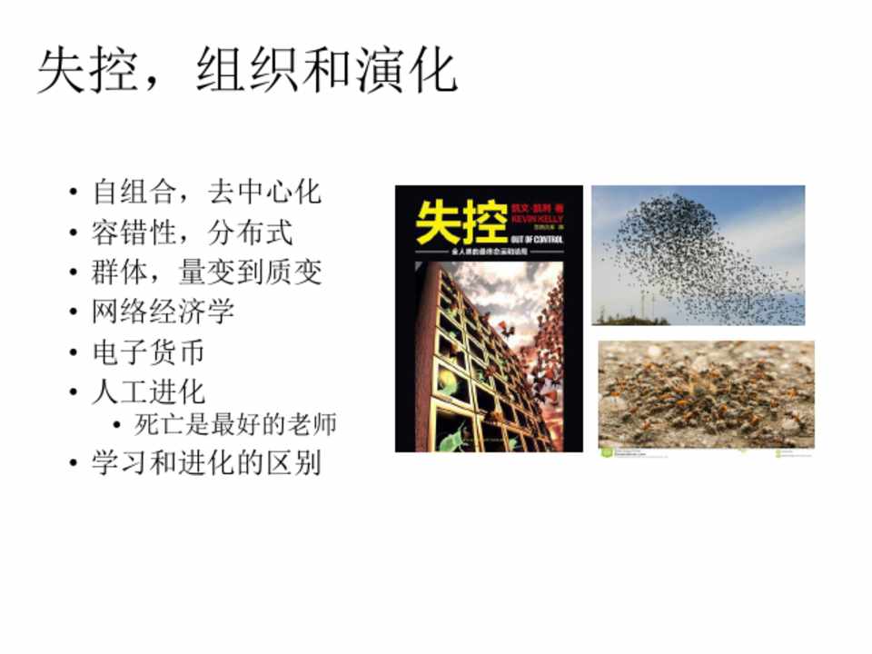 • 自组合,去中心化 • 容错性,分布式 • 群体,量变到质变 • 网络经济学 • 电子货币 • 人工进化