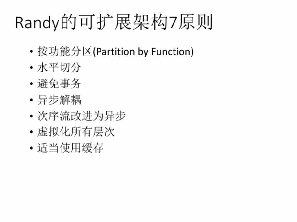 • 按功能分区(Partition by Function) • 水平切分 • 避免事务 • 异步解耦 • 次序流改进为异步 • 虚拟化所有层次 • 适当使用缓存