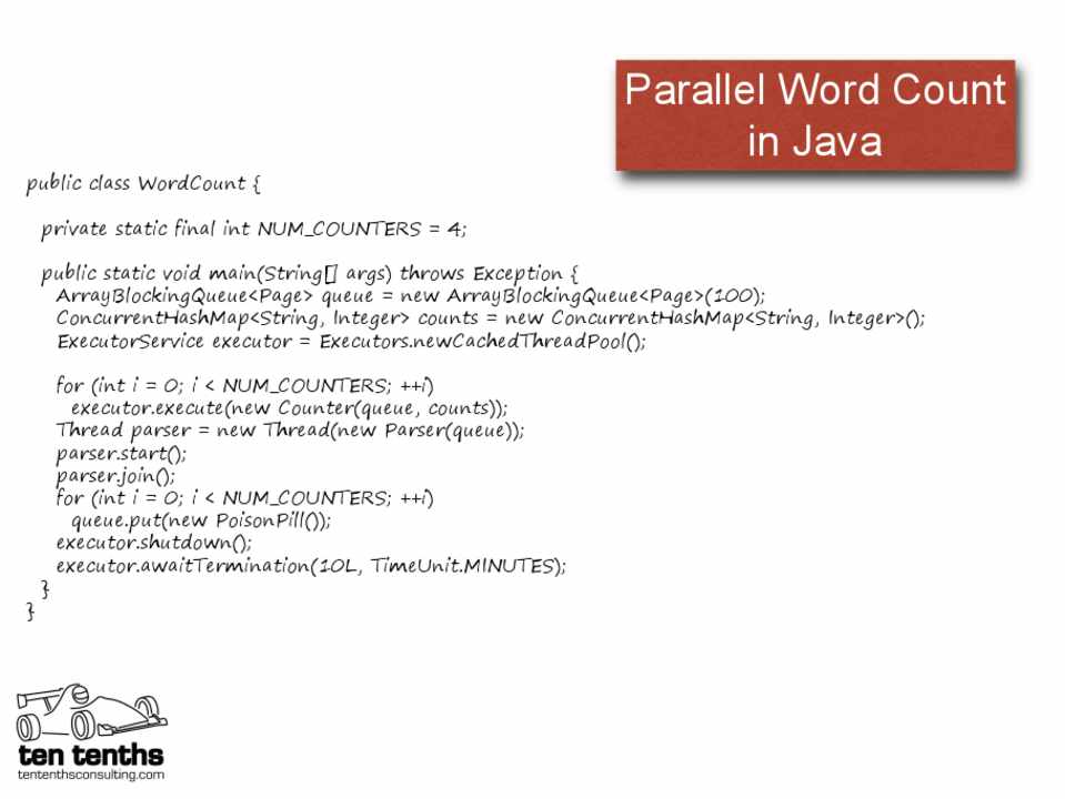 public static void main(String[] args) throws Exception { ArrayBlockingQueue<Page> queue = new ArrayBlockingQueue<Page>(100); ConcurrentHashMap<String, Integer> counts = new ConcurrentHashMap<String, Integer>(); ExecutorService executor = Executors.newCachedThreadPool();