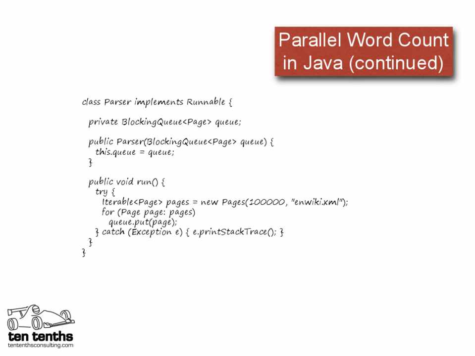 class Parser implements Runnable { private BlockingQueue<Page> queue; public Parser(BlockingQueue<Page> queue) { this.queue = queue; } public void run() { try { Iterable<Page> pages = new Pages(100000, "enwiki.xml"); for (Page page: pages) queue.put(page); } catch (Exception e) { e.printStackTrace(); } }