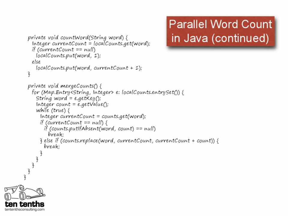 private void mergeCounts() { for (Map.Entry<String, Integer> e: localCounts.entrySet()) { String word = e.getKey(); Integer count = e.getValue(); while (true) { Integer currentCount = counts.get(word); if (currentCount == null) { if (counts.putIfAbsent(word, count) == null) break; } else if (counts.replace(word, currentCount, currentCount + count)) { break; } } }