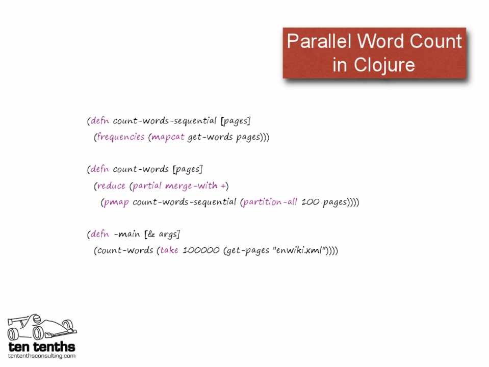 (defn count-words [pages] (reduce (partial merge-with +) (pmap count-words-sequential (partition-all 100 pages))))