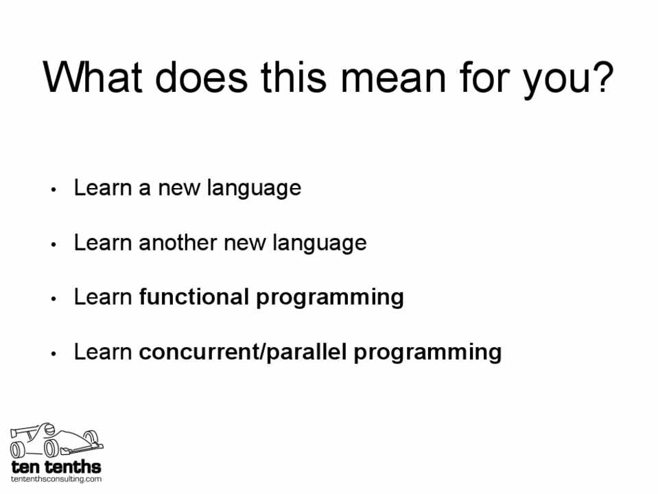 • Learn a new language • Learn another new language • Learn functional programming • Learn concurrent/parallel programming
