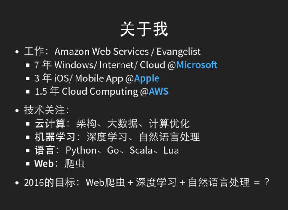 工作:Amazon Web Services / Evangelist 7 年 Windows/ Internet/ Cloud @Microso 3 年 iOS/ Mobile App @Apple 1.5 年 Cloud Computing @AWS
