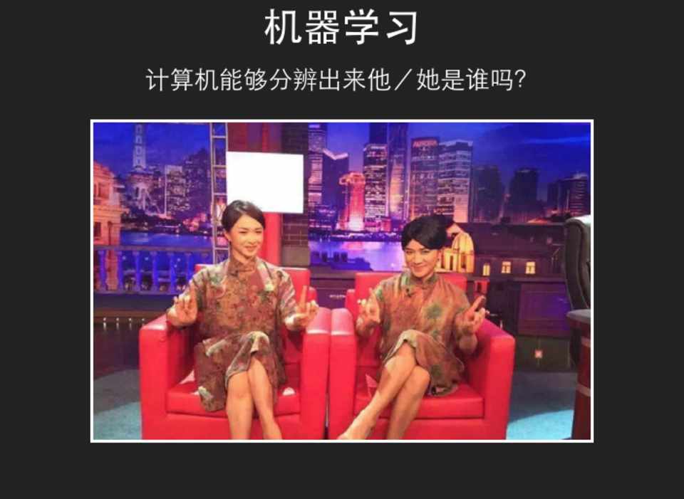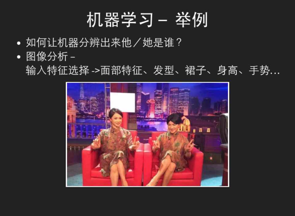 如何让机器分辨出来他/她是谁 ? 图像分析 – 输入特征选择 ->面部特征、发型、裙子、身高、手势…