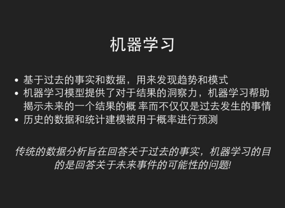 传统的数据分析旨在回答关于过去的事实,机器学习的目 的是回答关于未来事件的可能性的问题!