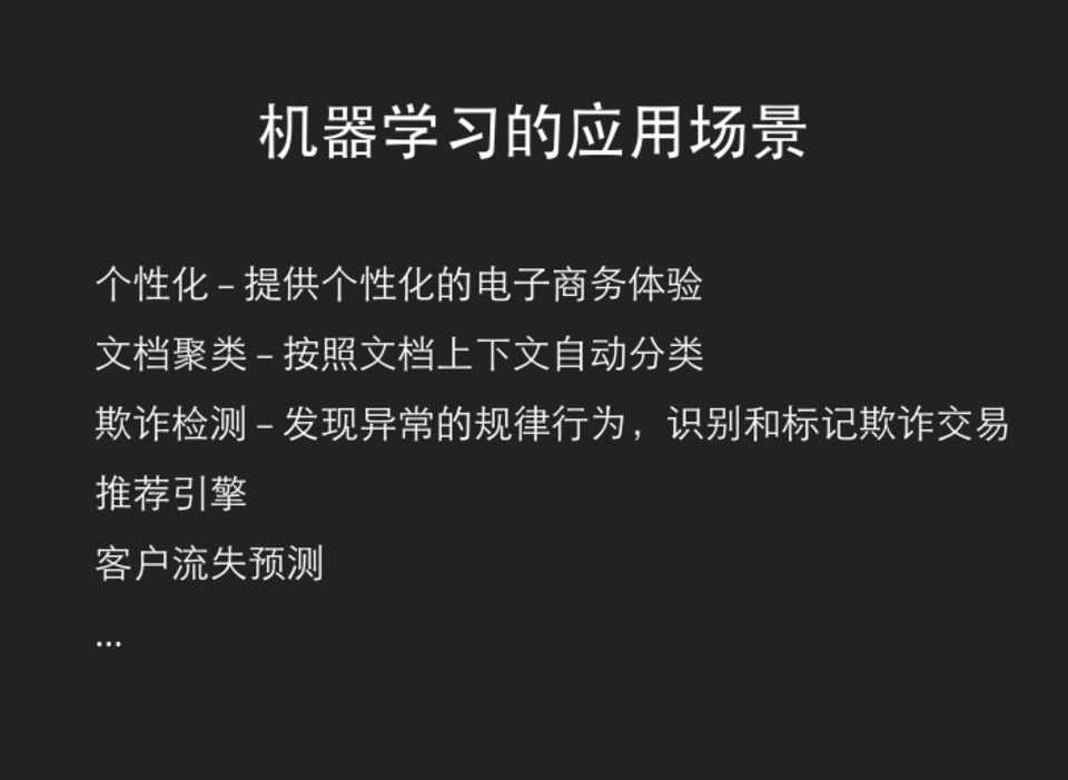 个性化 – 提供个性化的电子商务体验 文档聚类 – 按照文档上下文自动分类 欺诈检测 – 发现异常的规律行为,识别和标记欺诈交易 推荐引擎 客户流失预测 ...