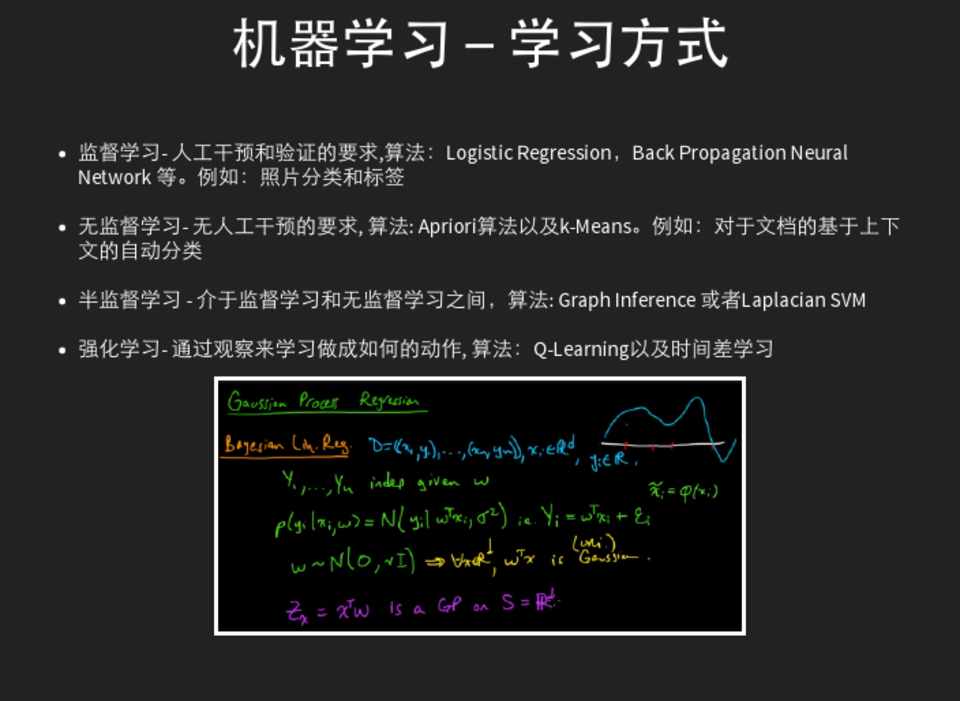 监督学习- 人工干预和验证的要求,算法:Logistic Regression,Back Propagation Neural Network 等。例如:照片分类和标签 无监督学习- 无人工干预的要求, 算法: Apriori算法以及k-Means。例如:对于文档的基于上下 文的自动分类 半监督学习 - 介于监督学习和无监督学习之间,算法: Graph Inference 或者Laplacian SVM 强化学习- 通过观察来学习做成如何的动作, 算法:Q-Learning以及时间差学习