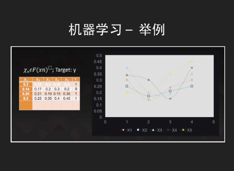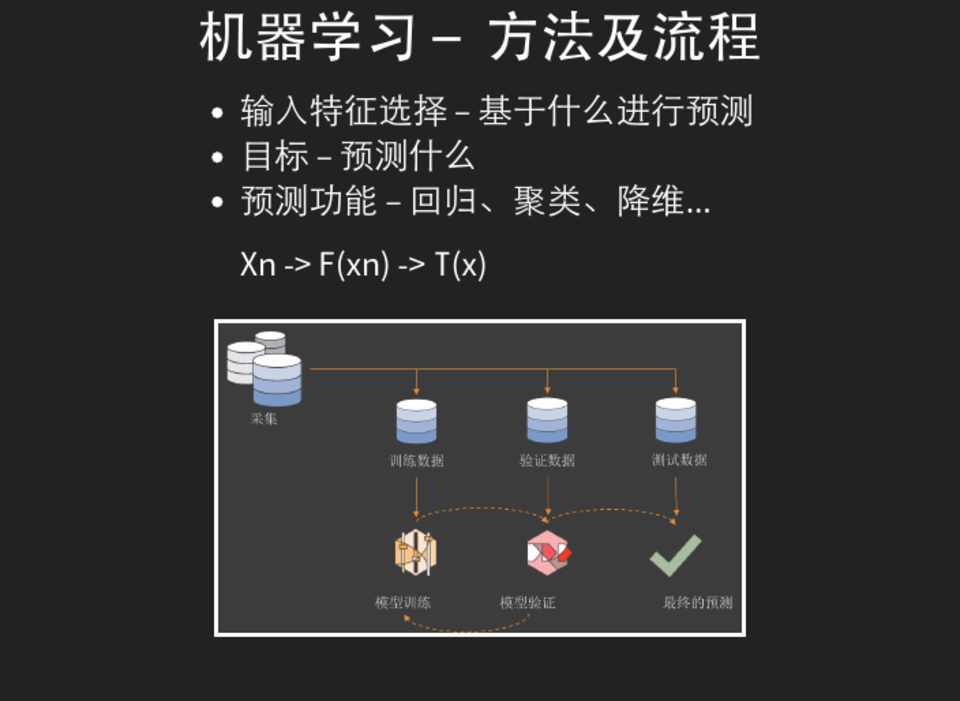 输入特征选择 – 基于什么进行预测 目标 – 预测什么 预测功能 – 回归、聚类、降维... Xn -> F(xn) -> T(x)