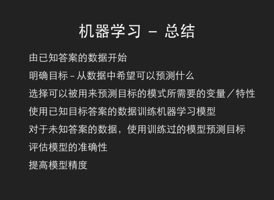 由已知答案的数据开始 明确目标 – 从数据中希望可以预测什么 选择可以被用来预测目标的模式所需要的变量/特性 使用已知目标答案的数据训练机器学习模型 对于未知答案的数据,使用训练过的模型预测目标 评估模型的准确性 提高模型精度