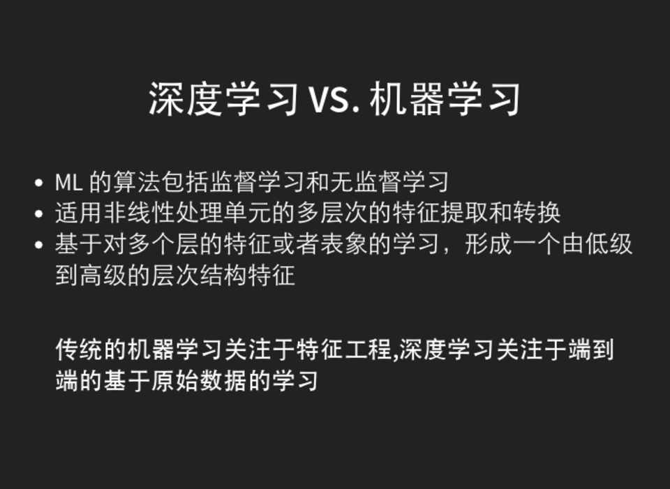 传统的机器学习关注于特征工程,深度学习关注于端到 端的基于原始数据的学习