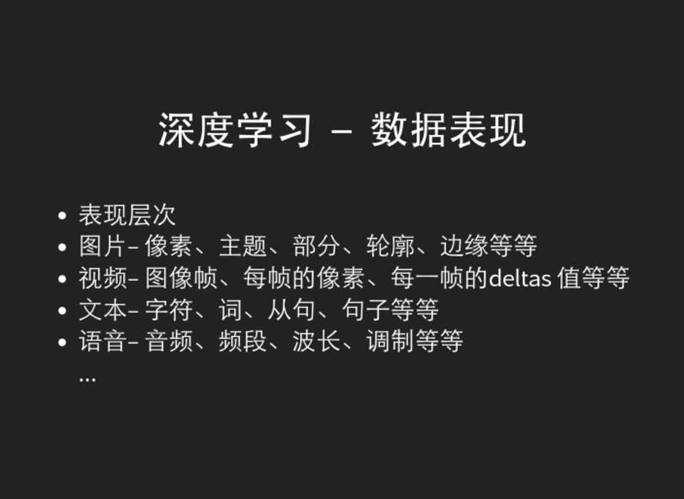 表现层次 图片– 像素、主题、部分、轮廓、边缘等等 视频– 图像帧、每帧的像素、每一帧的deltas 值等等 文本– 字符、词、从句、句子等等 语音– 音频、频段、波长、调制等等 ...