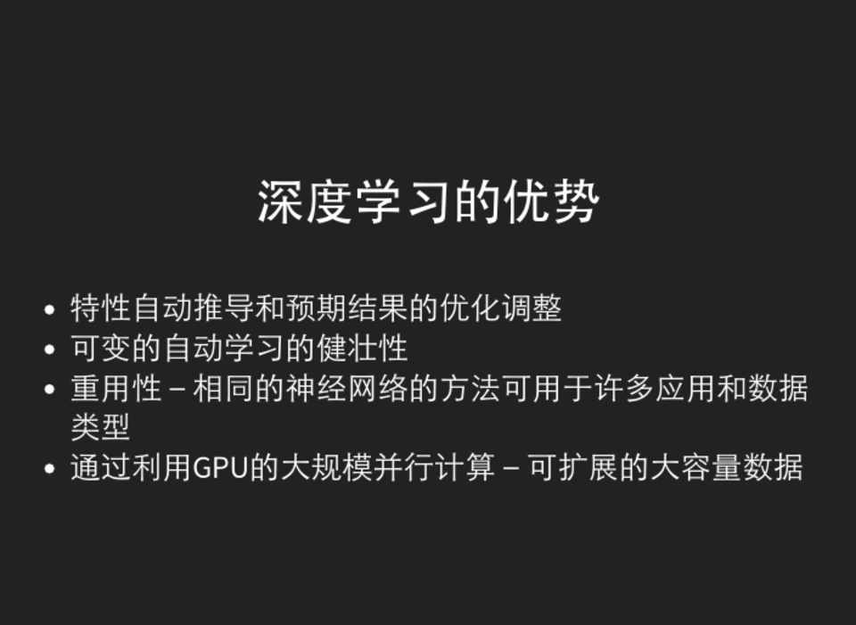 特性自动推导和预期结果的优化调整 可变的自动学习的健壮性 重用性-相同的神经网络的方法可用于许多应用和数据 类型 通过利用GPU的大规模并行计算-可扩展的大容量数据